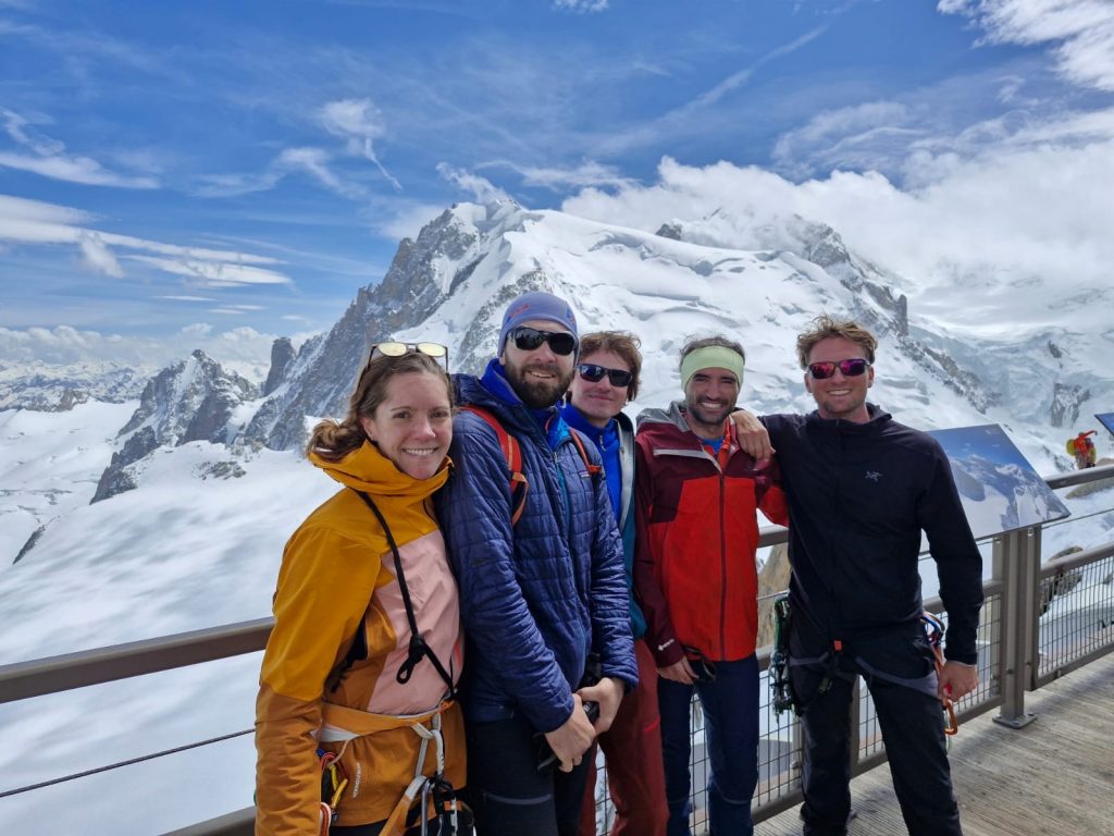 Cosmiques Grat mit Mont Blanc du Tacul im Hintergrund, Teamfoto