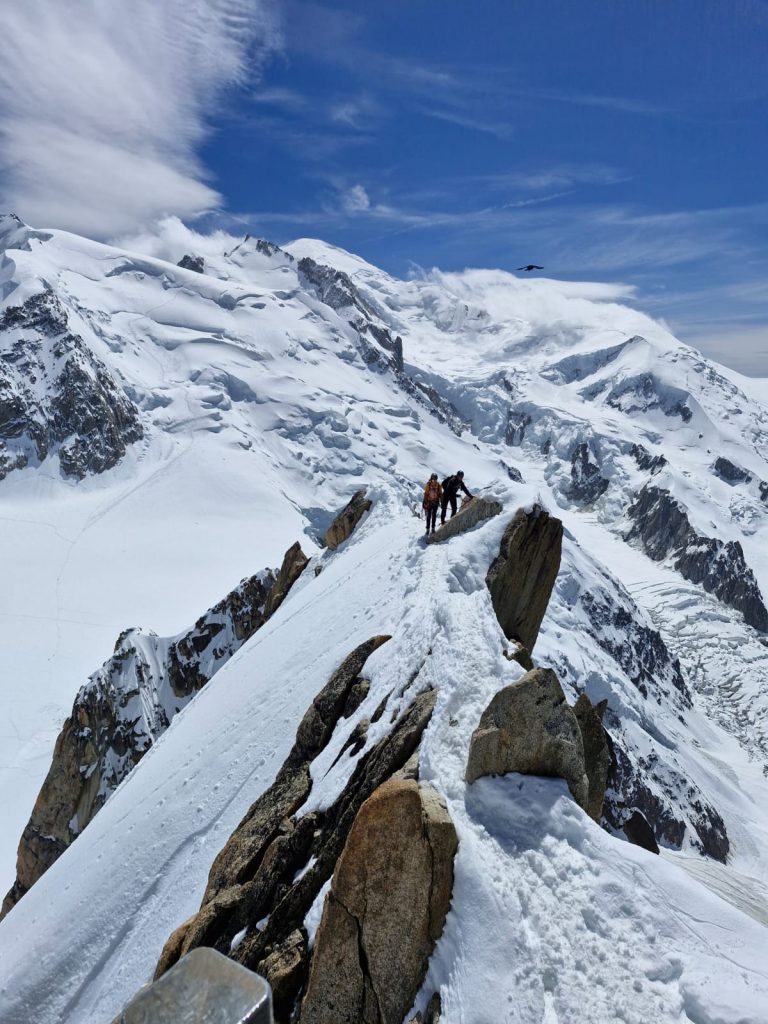 Von der Plattform aus geht es gleich nach der kleinen Metallschranke auf einen für den „Kaltstart“ sehr schmalen, ausgesetzten Schneegrat, von dem wir dann über den Gletscher zum Grat Arête à Laurence und weiter in den Cosmiques-Grat einstiegen. In zwei Seilschaften durchstiegen wir den Grat und passten unsere Strategie immer den jeweiligen Gratabschnitten an. Im abwechslungsreichen Mixed-Gelände wechselten sich seilfreies Gehen, Klettern am laufenden Seil, Sichern mit mobilem Standplatzbau, Abseilmanöver und Fixseiltaktik ab. Die größten Herausforderungen waren am Ende wohl zum einen die Schlüsselstelle mit in eine Granitplatte gebohrten Löchern für die Frontalzacken der Steigeisen, während den Händen lediglich ein schöner Riss blieb – und zum anderen der mittelgroße Stau am Abseilpunkt. Bei bestem Wetter ist man eben nicht allein. Die Ankunft über die letzten Türme bis zur Aiguille du Midi glichen einem Catwalk, da uns die Touristenscharen auf der Aussichtsplattform der Terrasse bereits mit Applaus empfingen. Die “Gipfelleiter” auf die Plattform zog die Aufmerksamkeit eines breiten Publikums auf sich und der Cappuccino mit Milchherzchen im Gipfelrestaurant war abschließend ein absolutes Highlight für Andrei, der die Kaffeekultur stets ausgiebig zu feiern weiß.