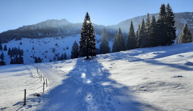 Winterspaß für Klein und Groß auf einer gemütlichen, leichten Schneeschuhtour im Bayerischen Alpenvorland.